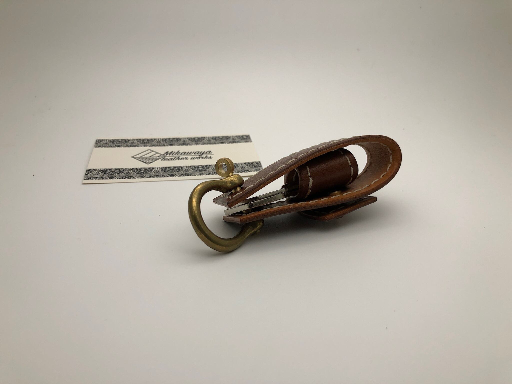 鍵がガチャガチャするのを防ぐ為にサイドからぐるっと巻いてギボシで留める仕様にいたしました。