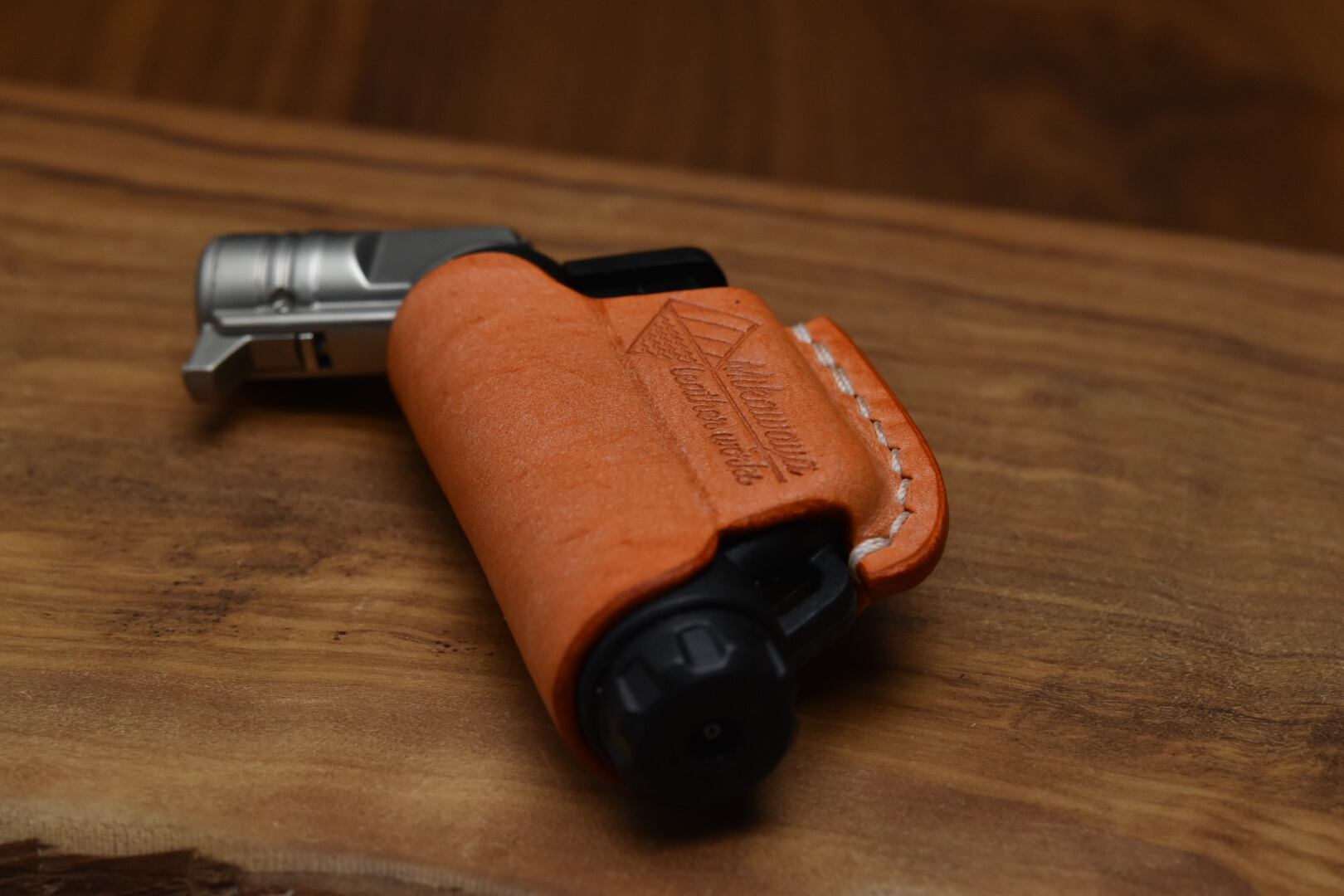 超小型強力耐風バーナーのマイクロトーチアクティブの革カバー。アウトドアの携帯ツールもカバーひとつで差をつけよう。