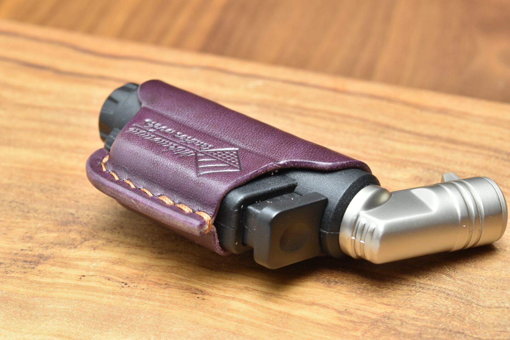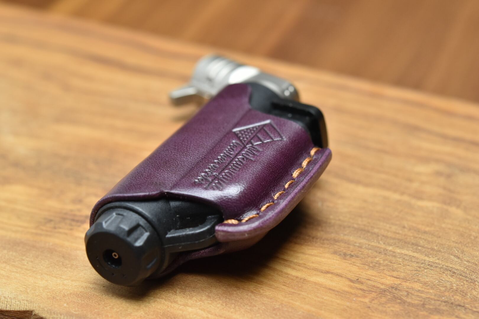 超小型強力耐風バーナーのマイクロトーチアクティブの革カバー。アウトドアの携帯ツールもカバーひとつで差をつけよう。